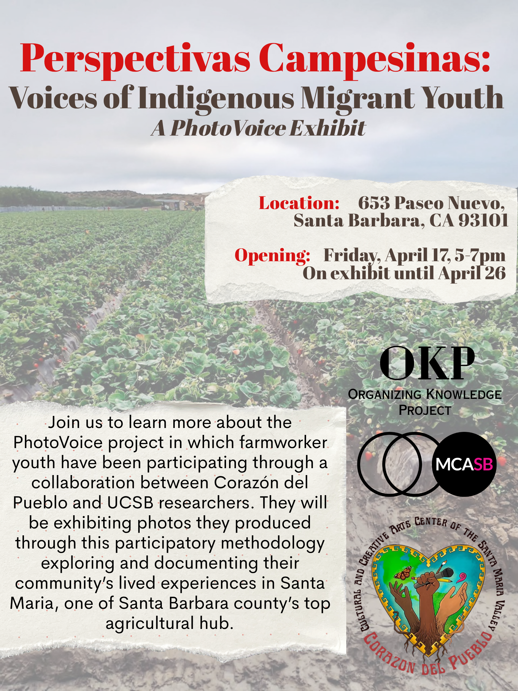 They will be exhibiting photos they produced through this participatory methodology exploring and documenting their community's lived experiences in Santa Maria, one of Santa Barbara county's top agricultural hub.